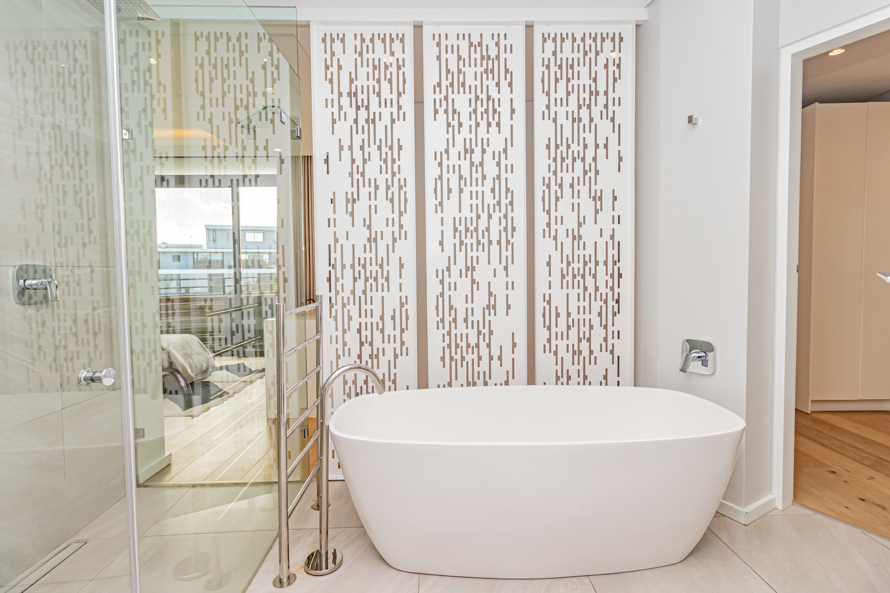 The master and second bedrooms both have en-suite bathrooms and access to a balcony with city views. The third bedroom is smaller and has an en-suite bedroom.