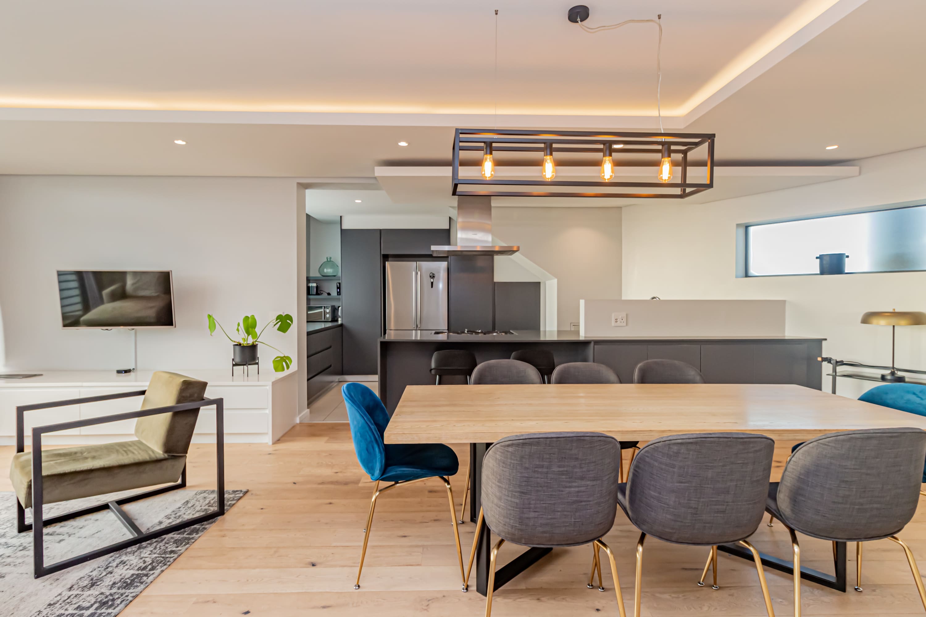 The living, dining and kitchen areas are open plan and beautifully furnished.